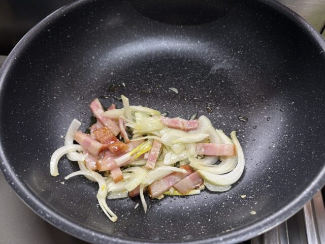冷めたフライパンにオリーブオイル、玉ねぎ、ベーコン、ニンニクを入れて中火にする。