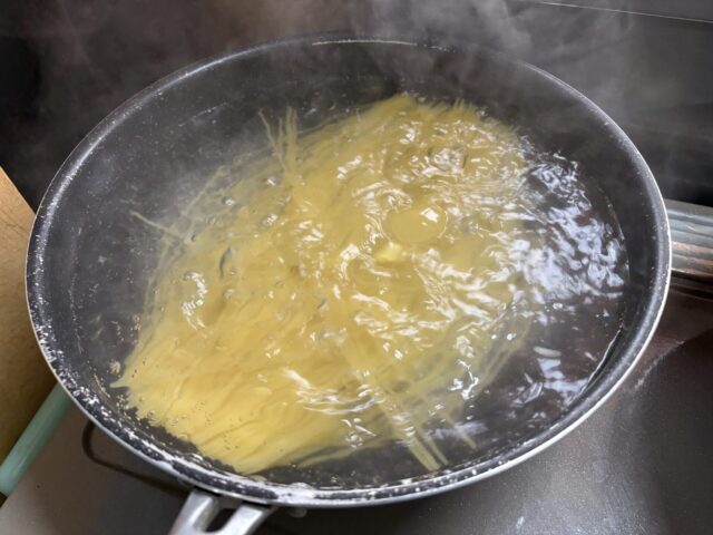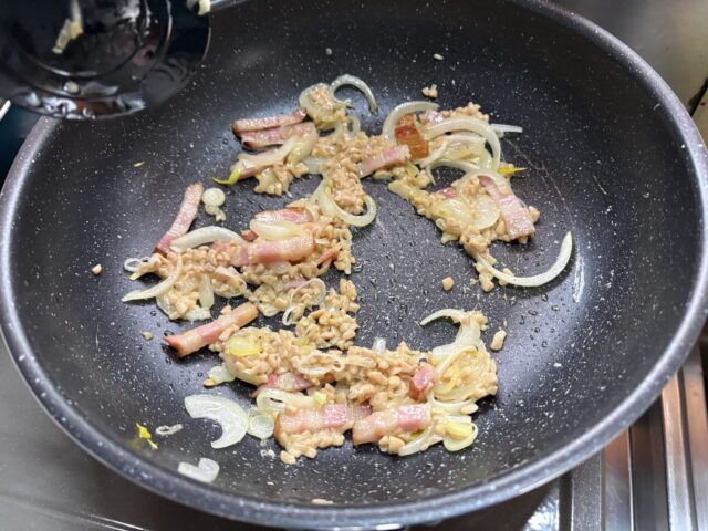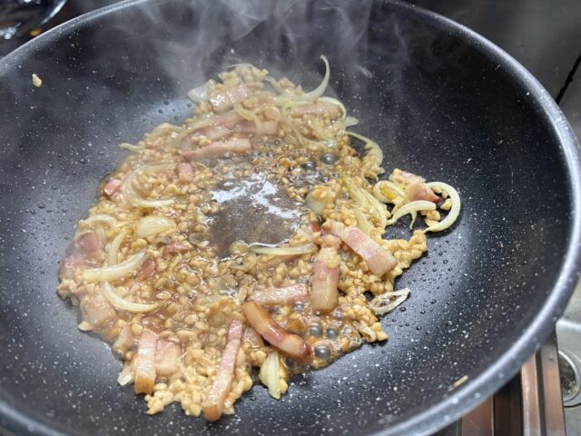 手際の良い方であれば、フライパンに納豆を入れるタイミングと同じくらいに茹でるとタイミングがちょうど良いと思います。