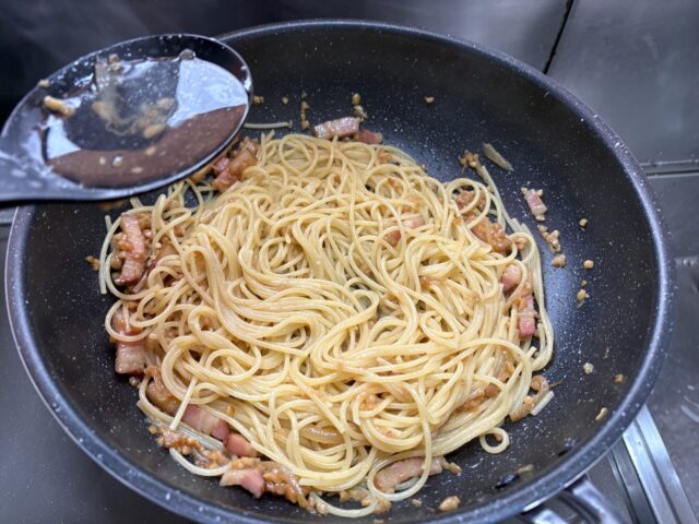 パスタとソースがよく絡んだら完成ですが、この時、必ず味見をしてください。