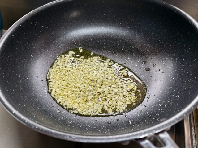 フツフツとしてきたら極弱火にして、ニンニクの香りを出す。